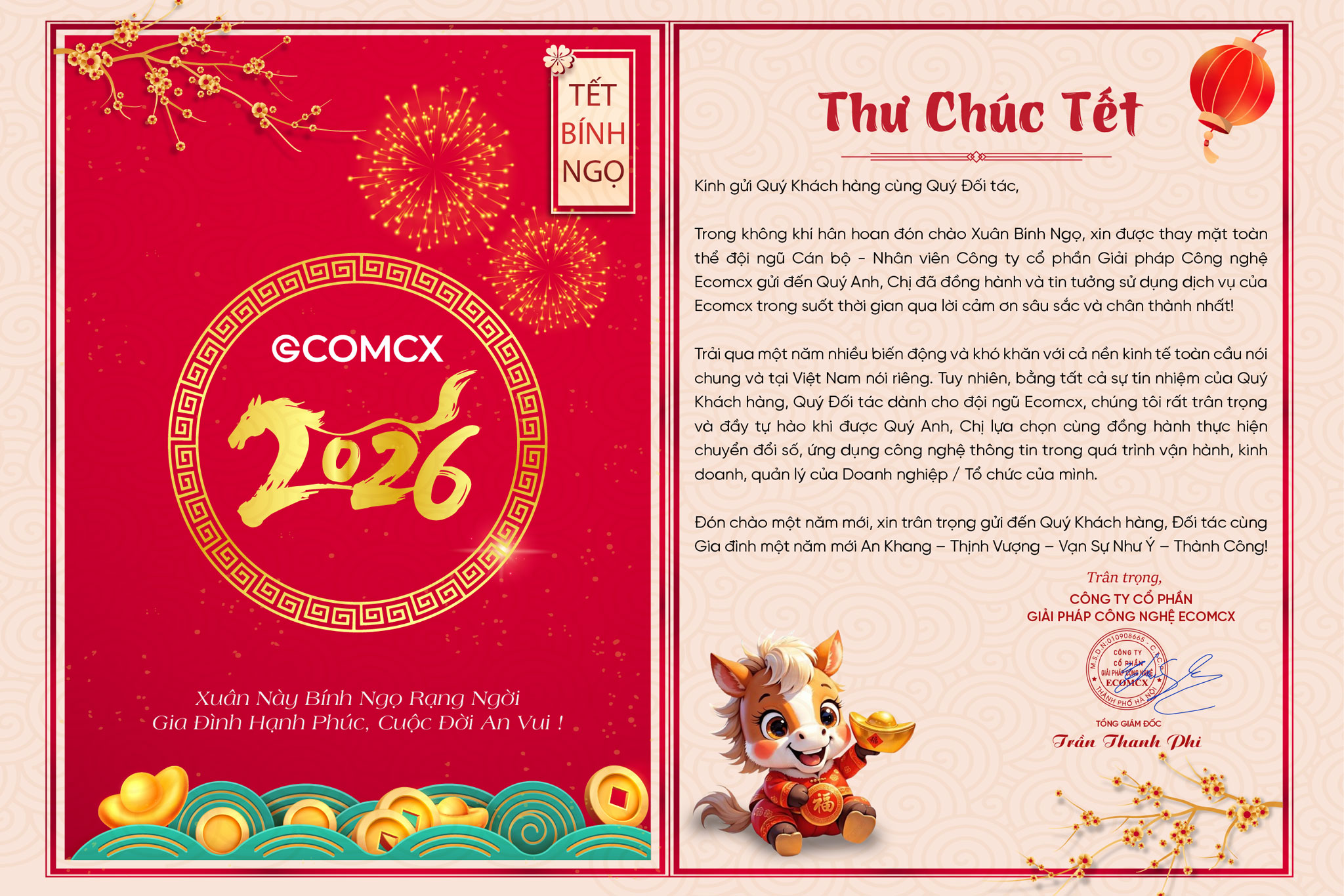 Trong không khí hân hoan đón chào Xuân Bính Ngọ, xin được thay mặt toàn thể đội ngũ Cán bộ - Nhân viên Công ty cổ phần Giải pháp Công nghệ Ecomcx gửi đến Quý Anh, Chị đã đồng hành và tin tưởng đồng hành cùng Ecomcx trong suốt thời gian qua lời cảm ơn sâu sắc và chân thành nhất!